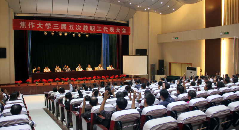 2012年10月11日下午,在南校区报告厅,召开了我校三届五次教职工代表大会,大会的主要任务是:审议通过《304永利集团登录入口教职工代表大会实施办法》。校领导郭维杰、林效廷、焦金雷、马韵新、符德学、杨中汉、张浦、申文波出席会议。会议由工会主席杨中汉主持,党委副书记焦金雷宣读决议,党委书记郭维杰作了重要讲话。全体代表本着对学校事业发展高度负责的态度,对大会的主要报告和文件进行了认真听取、讨论和表决,圆满完成了大会的各项议程。