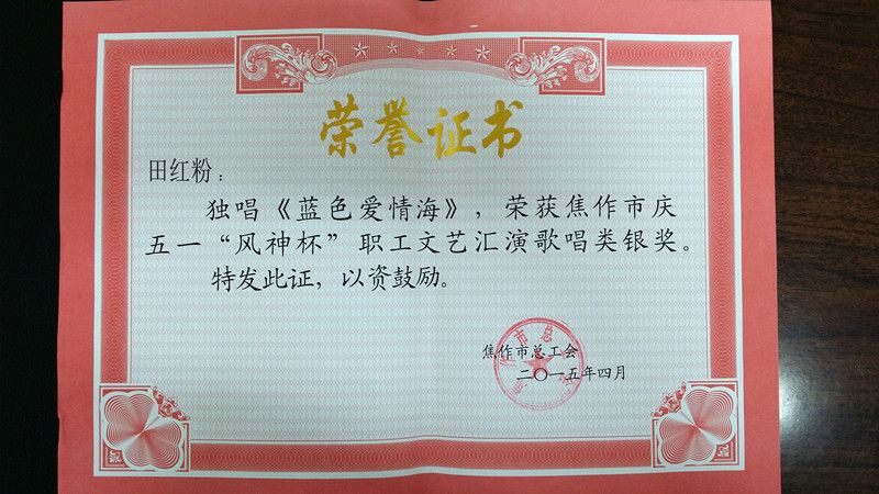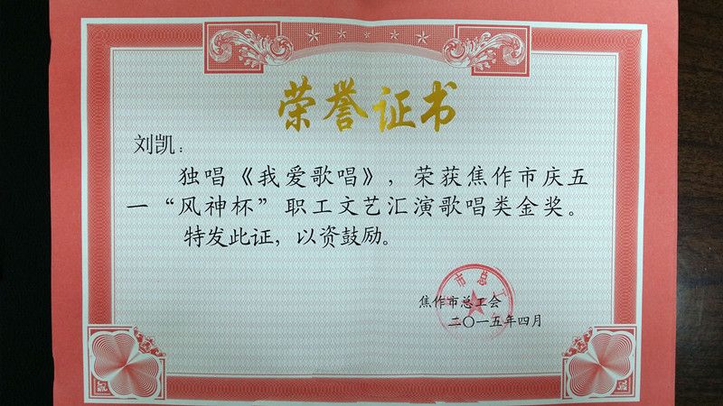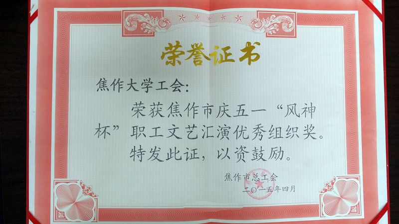 根据创建“美丽焦作”的需要,在今年“五一”国际劳动节期间,焦作市总工会在全市举行庆五一、“风神杯”职工文艺汇演,我校工会积极组织参加。经过奋勇拼搏,我校艺术学院教师刘凯的独唱-《我爱歌唱》荣获金奖、艺术学院教师田红粉的独唱-《蓝色爱情海》荣获银奖,同时我校工会荣获优秀组织奖。
